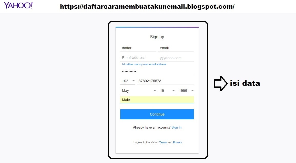 - Akan muncul halaman kolom pengisian formulir daftar yahoo atau sing up.